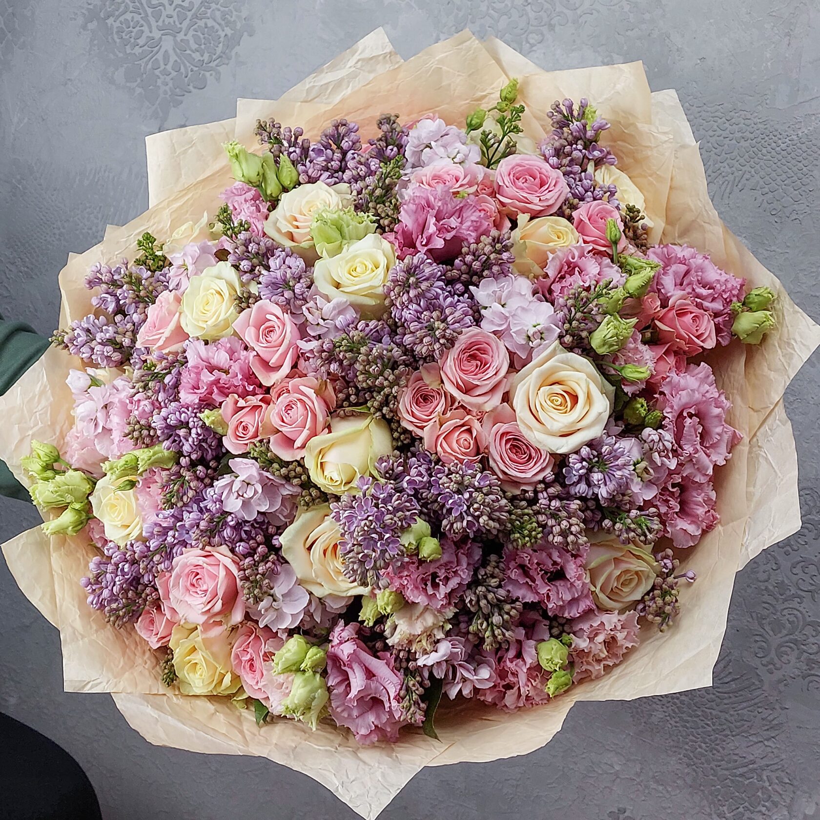 Букет из микса кустовых и одноголовых роз, сирени и лизиантуса наполнен теплом любви и нежностью объятий.